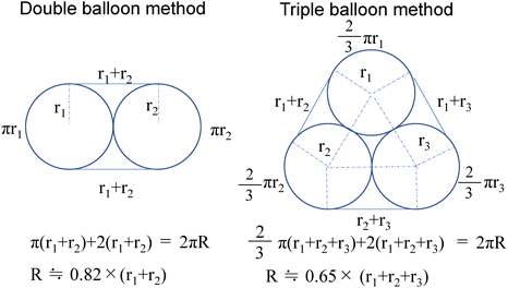シングルバルーン法による拡張では不十分で更に大口径バルーンが必要と判断した場合,ダブルバルーン法あるいはトリプルバルーン法も有効な方法である25–28).ダブルバルーン法では2つのバルーン径(r1とr2)から血管周囲長を計算しそれに見合う血管径が最狭窄部血管径に対してどのくらいの比率になるかによって2つのバルーン径を決定する.シングルバルーンに換算したバルーン径=0.82×(r1+r2)として算出される.トリプルバルーン法の算出方法も是非参考にされたい(Fig. 7).ここでFig. 8を供覧する.最狭窄部4.7 mm,近位参照血管径5.8 mm,遠位参照血管径8.8 mmであるため前述の理論から選択されるバルーン径は12 mmあるいは14 mmが妥当である.12 mm径あるいは14 mm径のシングルバルーンであると7Fr相当のシースが必要となるが,アクセスが1本増えるデメリットがあるものの,8 mm径のダブルバルーン法であれば5Fr相当のシースで治療が完遂できることになる.前述のようにより小口径バルーンの方が高耐圧を実現できることもあり症例に応じた道具選択が必要である.