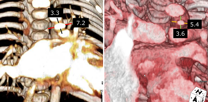 2-1) Type C PDA of 1 month old girl showed that the cross section of the PDA is ovale shaped with the longer diameter 7.2 mm and shorter one 3.3 mm. 2-2) Type C PDA of 1 year old girl. The cross section of the PDA is ovale shaped and the longer diameter is 5.4 mm and shorter one 3.6 mm. PDA, patent ductus arteriosus