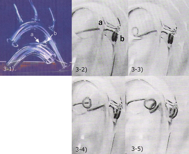 3-1) PDA glass model. 3-2) Two F-coil loops were fixed in the aortic end of PDA. 3-3, 4, 5) When the mandril was pulled back and the coil loops were pushed forward (3-3), the proximal coil loop moved forward and wedged between the 2 loops sitting more distally (3-4). This movement made bulky lump of coil loops which protruded into the pulmonary artery (3-5). Ao, aorta; PA, pulmonary artery; PDA, patent ductus arteriosus