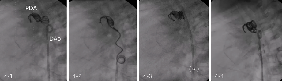 4-1) According to the mechanism explained in the Fig. 2), the coil loops made bulky lump and protruded in the descending aorta narrow. 4-2) The proximal part of the coil was caught and pulled back by a pigtail catheter until the twist of the coil loops was resolved and finally detached. 4-3) The direction of coil loops aligned with the PDA and the protrusion in the aorta became much better. The coil was pushed into the PDA by inflating the balloon of Berman® catheter (*)[Telefix; Morrisville, NC]. 4-4) PDA was totally occluded with one more coil. DAo, descending aorta; PDA, patent ductus arteriosus