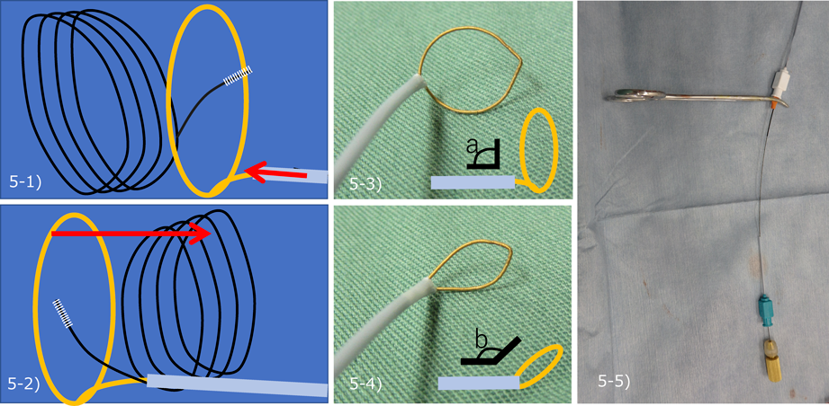 5-1) The coil loop should be caught by pushing the snare delivery catheter forward, not by pulling the snare loop backward, when the snare loop is sitting proximal to the coil. 5-2) The coil loop should be caught by pulling the snare loop back not by pushing the delivery catheter forward, when the snare loop is distal to the coil. 5-3) When the snare loop is fully opened, the loop makes 90-degee angle (a) with the delivery catheter. 5-4) However, when the snare loop is partially opened, the snare loop becomes smaller, oval-shaped and the the angle (b) between the snare loop and the delivery catheter becomes bigger. These changes make it difficult to catch a coil. 5-5) The snare wire should be snugged with forceps at the proximal edge of the hub not to accidentally detach when a migrated coil is retrieved.