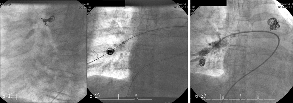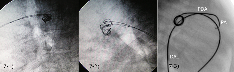 6-1) Three Flipper® PDA coils were deployed in the PDA of 67 years old woman. 6-2) However, they migrated into the right pulmonary artery. 6-3) As we didn’t have enough time and the delivery sheath suitable for retrieving 3 coils together, we pushed them more distantly after we occluded the PDA successfully with 5 coils including 0.052’ Gianturco® coil with 8 mm in diameter. The patient condition got much better after the procedure. PDA, patent ductus arteriosus