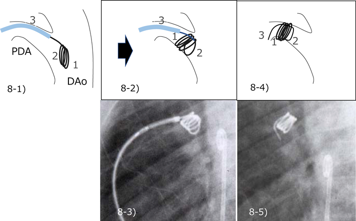8-1) The delivery catheter was advanced into the dAo from PDA side. 8-2, 3) Four coil loops were pulled back till they came at the PDA ampulla, which were moved into the PDA by the shunting flow across the PDA. At this moment, the coil loop 1 located more proximally than coil loop 2. 8-4, 5) When the most proximal coil loop and the screw were pulled back into the PA and detached, the coil looked like @ sign. DAo, descending aorta; PA, pulmonary artery; PDA, patent ductus arteriosus