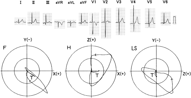 結論:高位肋間で出現したrsR′型は,合成VCG解析の結果,単極誘導から遠い部分の電位が減衰しループが前方偏位したと考えられた.深いQV6例は,誘導が1肋間上がるとQRSループに電極が接近し高電位が記録されたと考えた.