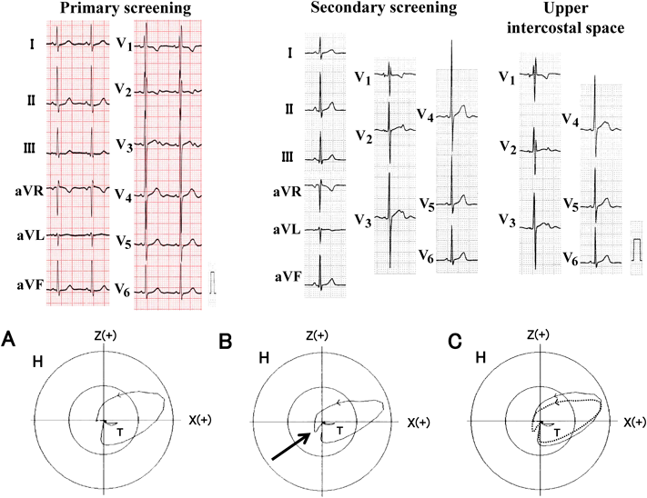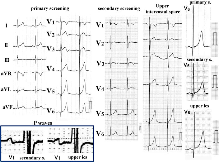 The Q wave, which is deep to 0.6 mV at primary screening, becomes shallow at secondary screening. The Q wave becomes deeper to 0.6 mV at the position of upward displacement of one intercostal space. Negative component of the P wave becomes prominent at upper position on the chest.