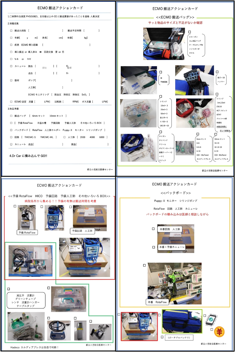 搬送手段は,電力・装備の安全性・移動手段の乗り換えに伴うリスクなどから総合的に判断し,陸路が選択された.車両は当院独自のECMO搬送を想定し設計されたドクターカーを使用することとした.搬送時間は最大10時間と想定し,搬送で必要な機器の消費電力と搬送中に使用する人工呼吸器およびECMOの酸素使用量の検討を行った.まず,ドクターカー内で使用する機器をリストアップし,その機器の消費電力と重量をまとめた(Table 1).搬送中の酸素使用量は,人工呼吸器で2 L/min(FIO2 0.4想定),ECMOの酸素流量は2 L/min(FIO2 1.0)で管理を行っていたため,全体で4–5 L/minと仮定した.携行酸素ボンベの総量は1,500 Lボンベを4本(うち2本はドクターカー内既搭載),500 Lボンベを4本の計8,000 Lを用意した.搬送前日に,ECMO搬送用バッグやアクションカード(Fig. 1)を用いて,緊急事態に備えるべくECMOの回路交換やカニューレの事故抜去までを想定した物品の準備を行った.また,搬送に関わる多職種によるブリーフィングを実施した.ブリーフィングでは,搬送当日の行程・搬送チームのリーダーの明示とそれぞれの役割を確認し,道中に給油が可能な場所や休憩場所をピックアップした.緊急時の立ち寄り場所として,搬送経路から近い,小児の3次医療施設に事前に緊急時の依頼をした.また,搬送中の事故抜去のリスクを最小限にするため,搬送前日に上行大動脈に1.5 cm程度の挿入長で留置していた送血カニューレを右総頚動脈に変更し(BioMedicus™ NextGen 12Fr),血管内に4.5 cm挿入した.脱血カニューレは,右内頸静脈が閉塞していたため右房からの下大静脈へ向けて2.5 cmだったものを5 cmの挿入長で再留置し(体外循環用カニューレフレックスメイト® TWN-18),胸骨間から体外へ導いた.それぞれのカニューレを創縁近傍の皮膚に2か所で固定し,胸骨は閉鎖せず皮膚にパッチを縫着し閉創した.