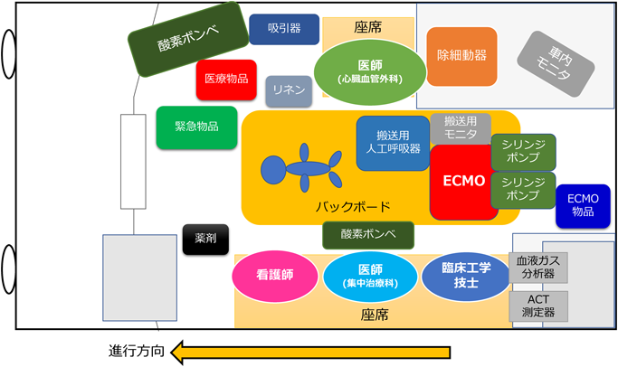 患児は,当院独自でECMO搬送用に開発作成したバックボードに,ECMO,シリンジポンプ,モニタを全て一体化したシステムを用いて移動を行った(Fig. 2).搬送車両内では,速やかに人工心肺用温度コントロールユニット(以下:冷温水槽)を接続し体温管理を行った.搬送中はドクターカーと,それに随行する車両を1台手配し,搬送チームを2チーム制とし途中で交代を行った.チームは指導医レベルの小児集中治療医1名,所定のトレーニングを終えたPICU看護師1名と臨床工学技士1名から構成した.小児集中治療医は搬送のリーダーとして,搬送中の各職種への指示や人工呼吸器・ECMOの設定の変更,薬剤投与,採血を実施した.PICU看護師は搬送中の経時記録や薬剤の準備,褥瘡予防などの看護ケアを行った.臨床工学技士はECMOモニタリングや回路の点検,ACT測定を実施した.また,外科的な緊急事態に備え,バックアップとして心臓血管外科医も1名同行した.搬送中はドクターカー内でFig. 3の配置につき,前述のとおり小児集中治療医,PICU看護師,臨床工学技士が2チーム交代制で車内にてそれぞれの業務を行った.ガソリンは車両と発電機で共用となっており,走行距離100 km程度を目安にドクターカーの燃料補充を行い停車した.停車中に患者・機器の詳細な確認とECMO管理上必要である酸素フラッシュや血液ガス分析・ACTの測定を行うとともに,チーム間で情報共有をし,搬送チームを交代した.搬送中のバイタルサインは,体温以外は大きな変化はなく経過した.集中治療室からドクターカー車内への移動で,中枢温35.5°Cとなっていたが,車内で冷温水槽を装着した後は,36.0°Cを下回ることはなかった.時に路面による振動が大きく,カニューレ挿入部付近への用手的に把持固定を追加したが,カニューレトラブルなく搬送を終了した.発進・ブレーキや振動により加速度が加わることでECMO流量が減少することが頻回にあったが,速やかに改善したため対応は要さなかった.路面の悪い道では減速して振動を最小限にするように努め,問題となるような左右の揺れは特になかった.出発時刻10時25分,到着時刻19時45分,走行距離520 km,搬送所要時間9時間20分(酸素実使用量は約2,400 L)のECMO搬送を重大な有害事象なく搬送することができた.
