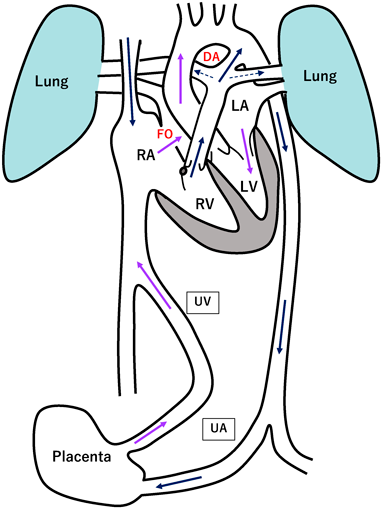 DA, ductus arteriosus; FO, foramen ovale; LA, left atrium; LV, left ventricle; RA, right atrium; RV, right ventricle; UA, umbilical artery; UV, umbilical vein