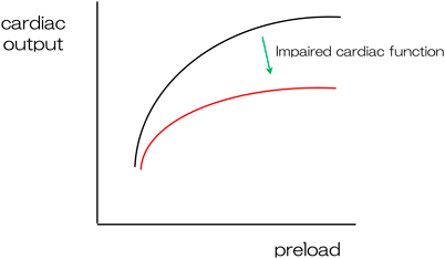 With normal cardiac function (black line), increasing preload increases cardiac output, although after exceeding a certain preload there is no further increase in cardiac output. If the cardiac function is impaired (red line), cardiac output cannot be increased even at early levels by an increased preload.