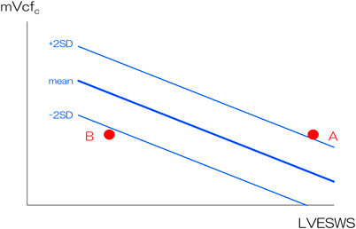 If the horizontal axis represents the left ventricular end-systolic wall stress (LVESWS), which is an index of afterload, and the vertical axis represents the rate-corrected mean velocity of fiber shortening (mVcfc), which is an index of cardiac pump function, there is a linear relationship. It can be determined that the contractility is good on the positive side and the contractility is bad on the negative side of this standard straight line.