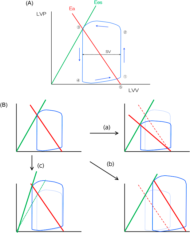 (A) Left ventricular pressure-volume curve. (B) Changes in the left ventricular pressure-volume relationship by therapeutic intervention (a) If treatment is performed to reduce afterload without changing preload and contractility, the slope of Ea becomes gentle, so the left ventricular systolic pressure (=blood pressure) decreases, but the stroke volume increases. (b) If the preload is increased without changing the contractility and afterload, the left ventricular systolic pressure (=blood pressure) and the stroke volume increase. (c) If the contractility is increased without changing the preload and afterload, the slope of Ees becomes steep, and the left ventricular systolic pressure (=blood pressure) and the stroke volume increase. Ea, effective arterial elastance; Ees, end systolic elastance; LVP, left ventricular pressure; LVV, left ventricular volume; SV, stroke volume