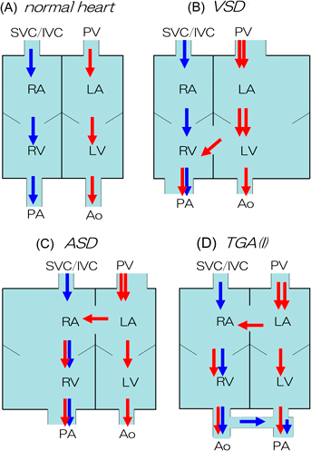 (A) Normal heart: A single arrow represents normal blood flow (unit of normal cardiac output). Red arrows represent arterial blood and blue arrows represent venous blood. (B) VSD (Ventricular septal defect): Double arrows represent that there is more blood flow than normal. Because of the difference between pulmonary and systemic vascular resistance, a left to right shunt usually occurs between the ventricles, which causes a large amount of blood flow to the pulmonary arteries, the pulmonary veins, the left atrium, and the left ventricle, leading to enlargement of these vessels and chambers. (C) ASD (Atrial septal defect): On the other hand, in the case of ASD, because of the difference in compliance between the right and the left ventricle, a left to right shunt usually occurs between the atrium, which causes a large amount of blood to flow to the right atrium, the right ventricle, the pulmonary arteries, and the pulmonary veins, leading to enlargement of these compartments. (D) TGA (I) (Complete transposition of the great arteries without ventricular septal defect): Patients with TGA (I) cannot survive without mixing of blood between the left and right heart systems because oxygenated blood cannot be sent to the systemic circulation. In order to supply oxygenated blood to the systemic circulation, mixing of blood through the foramen ovale is most important. If there is only a small amount of shunt from the left to the right atrium, the oxygen concentration in the systemic circulation will be low. To increase left-to-right shunt in the atrium, it is necessary to keep the ductus arteriosus open. In the ductus arteriosus, blood usually flows from the aorta to the pulmonary artery according to the difference in vascular resistance, so that the amount of return from the pulmonary veins to the left atrium also increases, and the shunt from the left atrium to the right atrium also increases, resulting in more oxygenated blood that can flow to the systemic circulation. Ao, aorta; IVC, inferior vena cava; LA, left atrium; LV, left ventricle; PA, pulmonary artery; PV, pulmonary vein; RA, right atrium; RV, right ventricle; SVC, superior vena cava