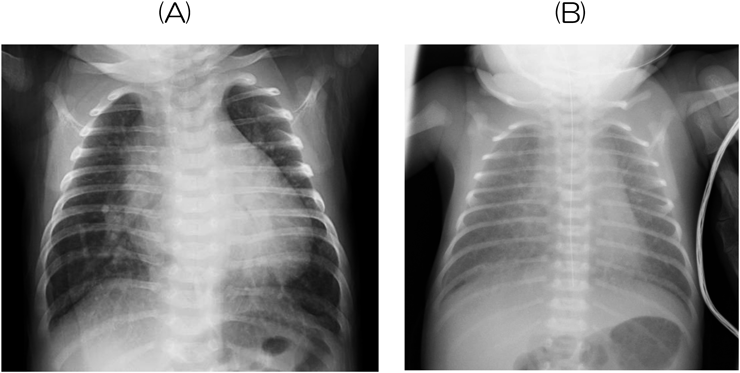 (A) Increased pulmonary blood flow; A 1-month-old boy with ventricular septal defect. It shows cardiomegaly (the cardiothoracic ratio 64%), and left mainstem bronchus elevation, suggesting left atrial enlargement. The enlarged pulmonary arteries extend into the lateral lung field, and the external diameter of the pulmonary artery is wider than the internal diameter of the trachea. (B) Pulmonary venous congestion; A 3-day-old girl with total anomalous pulmonary venous return. It shows the hazy and indistinct margin of the pulmonary vasculature. The margin of the cardiac border is also unclear, and there is no cardiomegaly.