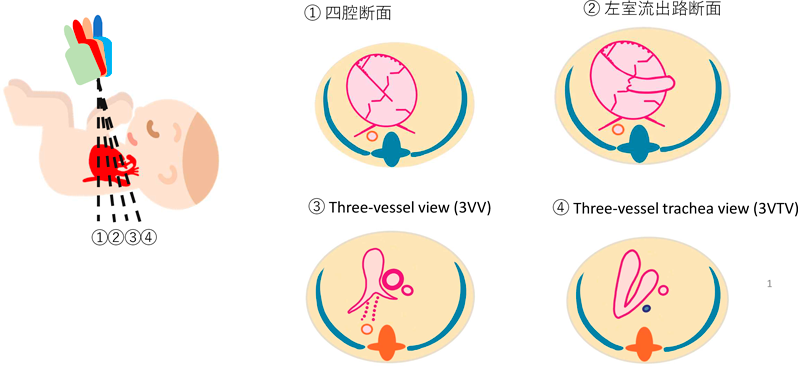 胎児では肺は水で満たされており,任意の方向から胎児心臓を描出できるため心臓CT検査のように胎児胸郭の水平断面をスキャンして心臓と大血管を評価する.具体的には,一定の手順で四腔断面(図1-①)を描出し,次はプローブを胎児の頭側へ動かすと左室から大動脈が起始する左室流出路断面(図1-②),さらに動かすと肺動脈,大動脈,上大静脈が一列に並ぶThree-vessel view(3VV:図1-③)が描出される.さらに頭側へ動かし大動脈と動脈管がV字型につながるThree-vessel trachea view(3VTV:図1-④)まで描出して心臓から両大血管と動脈管までを連続的に観察すれば,ほとんどの先天性心疾患の胎児診断は可能である7, 8).