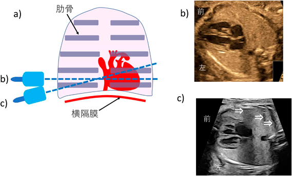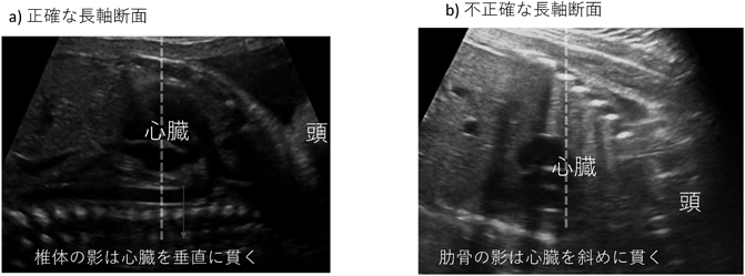 〈きれいな四腔断面〉とは胎児胸郭の正確な水平断面から得られた四腔断面のことであり,その確認は水平に走行する胎児肋骨の影を利用する.〈きれいな四腔断面〉(図2b)では肋骨の影はなく,超音波は肋間を通過するので心臓も明瞭に描出される.一方,胸郭に対して斜めの断面では,肋骨の縞状の影を認め,胸腔内も不明瞭となる(図2c).心臓も斜めに描出されているので心室や房室弁の大きさや位置は正確に評価できないために,大動脈縮窄症や総肺静脈還流異常などの軽度心室バランス異常や修正大血管転位症などの心臓軸の異常が特徴的な心疾患を見逃す原因となる.〈きれいな四腔断面〉を描出するには,肋骨の影に注意して正確な水平断面であることを確認しながら検査を行うことが大切である.