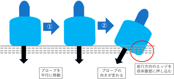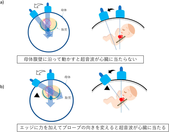 初心者はプローブを単純に母体腹壁に沿って動かす傾向にあるが,その操作ではプローブの向きと心臓位置がずれるので意図した断面は得られず,また画面から心臓が見えなくなることもあり胎児心エコー検査が難しく感じる原因の一つである(図3a).胎児心エコー検査では〈プローブを移動+進行方向のエッジに力を加える〉操作を行うとよい(図3b, 4).進行方向のエッジに力を加えることでプローブの向きが変わるので,画面を見ながら心臓が画面から消えないようにプローブ先端に力を加えながら動かすと目的の断面を得ることができる.注意点は,経胸壁心エコー検査の様にプローブを軽く握り先端に力を加えない持ち方ではこの操作は難しいため,プローブをしっかり握り,先端にもある程度の力を加えて操作することも必要である.