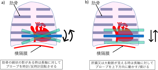 そのために〈きれいな四腔断面〉を描出しても心尖部が下向きの場合は,プローブを操作して心尖部が上向きになる〈観察しやすい四腔断面〉にすれば,簡単に〈きれいな基本断面〉を描出できるので,次は心尖部が画面上向きの〈観察しやすい四腔断面〉の出し方について解説する.