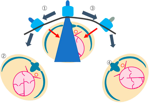 ここで用いるテクニックも〈プローブを移動+進行方向のエッジに力を加える〉操作である.心尖部が下向きの四腔断面(図8)を例にとると椎体の影のために四腔断面から心臓の観察はできないが,プローブを胎児の右へ移動しながら先頭のエッジに力を加える(図8-①)と椎体の右側から超音波が胸腔内に入るので心尖部が下向きの四腔断面(図8-②)となる.また反対方向に動かせば心尖部が横向きの四腔断面(図8-③④)となる.この断面から流出路から3VTVを観察してもよいが,さらに大きくプローブを動かせば心室中隔が上向きの〈観察しやすい四腔断面〉となり基本断面を簡単に描出できる.プローブを動かす距離や力の加え具合は画面を見ながら調整するが,母体腹壁を広く使用することがポイントである.