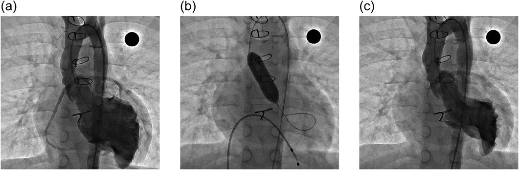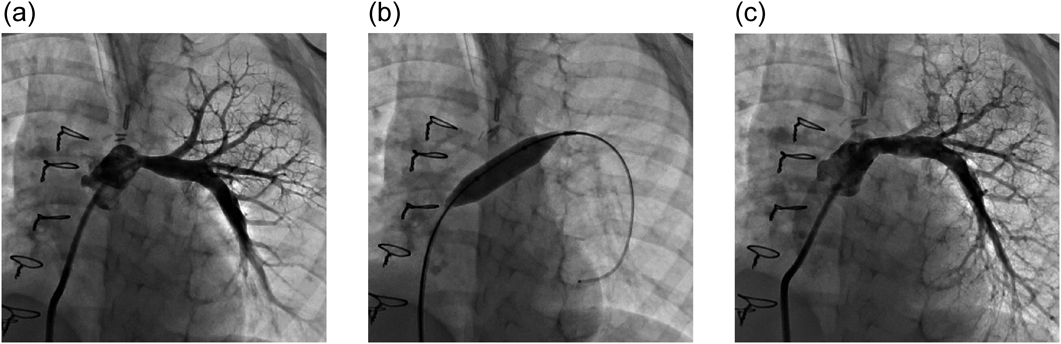 (a) Severe stenosis is observed in the proximal portion of the left pulmonary artery. The diameter of the stenotic site was 3.5 mm, and the diameter of the distal left pulmonary artery was 6.1 mm. (b) Pulmonary artery angioplasty using an ultra-high-pressure balloon (9 mm). The disappearance of the waist was observed. (c) Pulmonary artery angiography after pulmonary artery angioplasty. The stenosis in the proximal portion of the left pulmonary artery has improved.