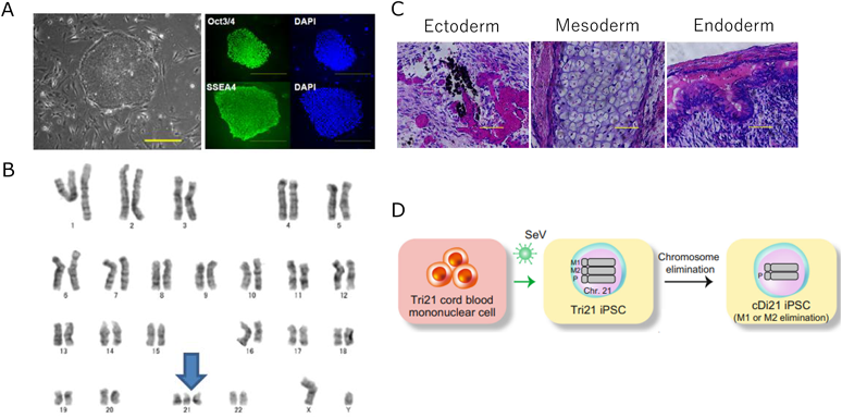 (A) Phase contrast and immunocytochemical images of iPSCs. (B) Established iPSCs possess trisomy 21. (C) Three germ layer differentiation was confirmed by histological assays. (D) Schematic image of establishment of trisomy 21 (Tri21) iPSCs by using Sendai virus vector (SeV) and correction disomy 21 iPSCs (cDi21). (Modified from ref. 25 and 26)