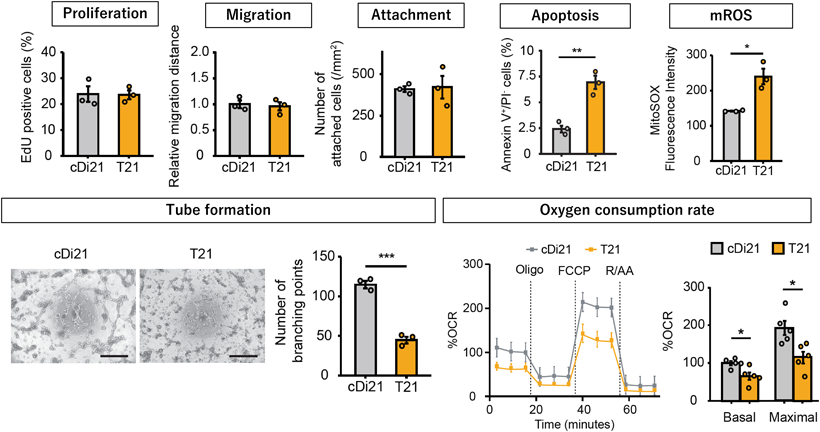 The cellular proliferation, migration, attachment abilities were not significantly different. In contrast, apoptosis and mitochondrial reactive oxygen species (mROS) were significantly elevated in T21-ECs. Angiogenesis and oxygen consumption rate were significantly impaired in T21-ECs as compared to cDi21-ECs. *p<0.05, **p<0.01, ***p<0.001. (Modified from ref. 24)