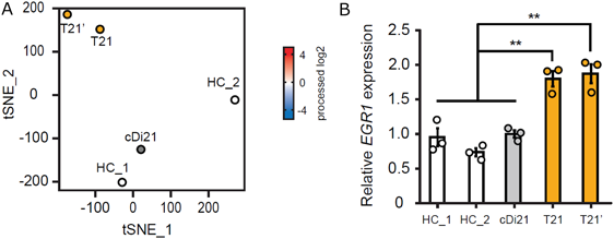 (A) T-distributed Stochastic Neighbor Embedding (tSNE) plots of comprehensive gene expression profiles of two independent lines of trisomy 21 (T21 and T21’), correction disomy 21 (cDi21), and healthy controls (HC_1 and HC_2) vascular endothelial cells. T21 and T21’ showed significantly distinctive gene expression profiles as compared to cDi21 and HCs. (B) Quantitative PCR analysis for EGR1. EGR1 is extensively expressed in T21 and T21’ as compared to cDi21 and HCs. **p<0.01. (Modified from ref. 24)