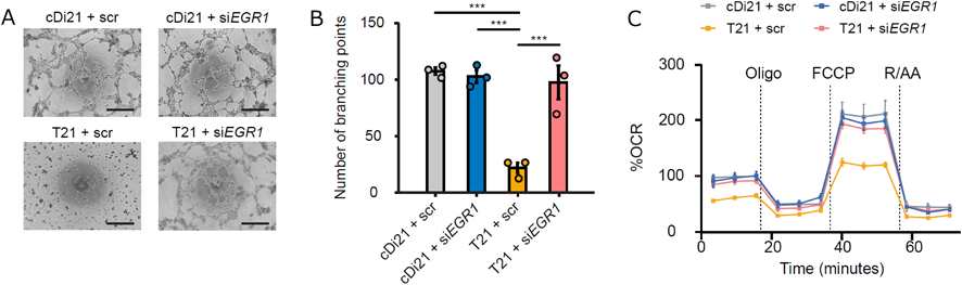 (A) Representative phase contrast images of tube formation assays in T21-ECs and correction disomy 21 (cDi21)-ECs treated with siEGR1 and scramble (scr) siRNA. (B) Quantitative analyses of tube formation assays showed significant improvement of endothelial function in T21-ECs treated with siEGR1. (C) Oxygen consumption rate (OCR) was significantly improved by treating with siEGR1. ***p<0.001. (Modified from ref. 24)