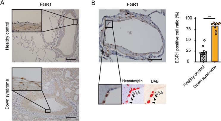 (A) Immunohistochemical analysis for EGR1 in the pulmonary arteries of a Down syndrome patient and a healthy control. (B) Representative images of quantitative analysis for EGR1 expression in pulmonary arterial endothelial cells by using ImageJ software. (C) EGR1 expression in the pulmonary arterial endothelial cells of the Down syndrome patient was significantly higher than that of healthy control. ***p<0.001. (Modified from ref. 24)
