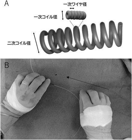 A)コイルの基本構造.一次コイル径(0.010”~0.035”)が太いほど硬い.一般的には血管径の1.3~1.5倍の二次コイル径のものを選択するが,コイルの種類や年齢,解剖などによって異なる.B)折れずにデリバリワイヤーを進めるためには第3, 4指をワイヤーに軽く沿えてイントロデューサーシースにまっすぐ進める.