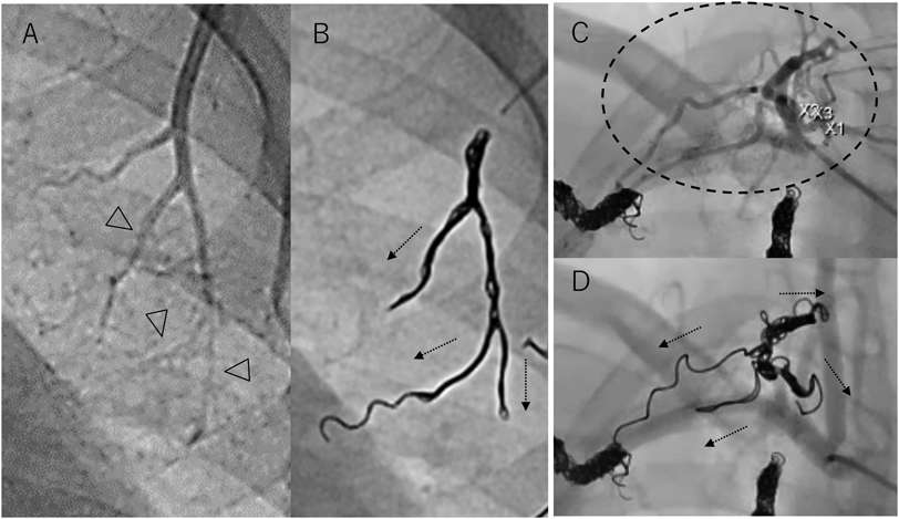 A, B)18歳フォンタン術後患者における外側胸動脈の塞栓.末梢分枝の径は1 mm以下であったが,Target™ XXLコイル6 mm×40 cm, 5 mm×20 cmでそれぞれの分枝(矢頭)に入り込んで(矢印)塞栓した.C, D)11歳フォンタン術後患者における複雑に分枝した体肺側副動脈(点線円)の塞栓.分枝の血管径は1~1.5 mmであったが,Target™ XXL 5 mm×20 cm×2本で分枝に入り込むように塞栓した(矢印).