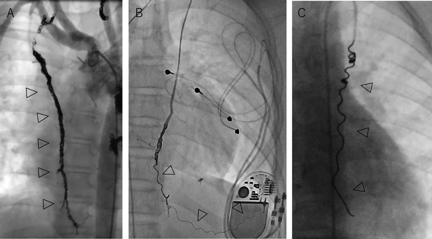 いずれもフォンタン患者における内胸動脈塞栓治療.A)長い内胸動脈を末梢からコイルを積み上げると11本のコイルが必要であった(矢頭).B)内胸動脈の末梢にAzur™18 5 mm×20 cmを巻かずにルーズに留置(矢頭).C)親カテを内胸動脈末梢まで挿入しAzur™35 4 mm×15 cmを末梢から巻かずに留置(矢頭).外膨潤型のAzur18, 35は膨潤によるコイル自体の体積増加が期待できる.