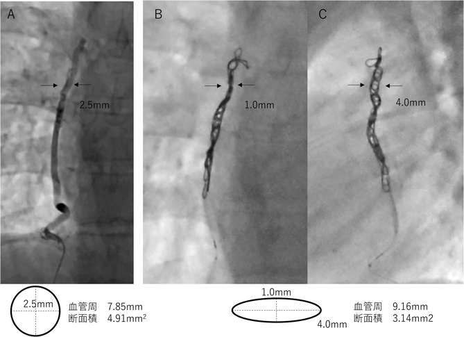 静脈静脈短絡では動脈に比べ柔らかく,また小児では動脈でも成人と比べると柔らかく,大きめのコイル径が選択されることが多い.親カテが安定していれば当院では血管径の3~4倍の二次コイル径のものを選択して効率的な塞栓を行っている.Fig. 4Aの症例では,正面像2.5 mm×側面像2.5 mmの静脈静脈短絡血管に対してTarget™ XXL 6 mm×40 cmを八の字型に留置したところ,1本で塞栓された.留置後のコイル形態をFig. 4B, Cで見ると矢印部分でのコイル径は正面像1.0 mm×側面像4.0 mmであり,大きいコイルを使用することで血管が楕円状に変形したことが確認された.これを血管の断面で考えるともともとの血管の血管周長=7.85 mm,断面積=4.91 mm2に対して,コイル留置後の楕円の血管周長=9.16 mmと伸長したが断面積は3.14 mm2と減少していた.柔らかい血管では大きめのコイルで血管を楕円状にしたほうが血管の断面積を減らすことができ効果的な塞栓が期待できると我々は考えている.