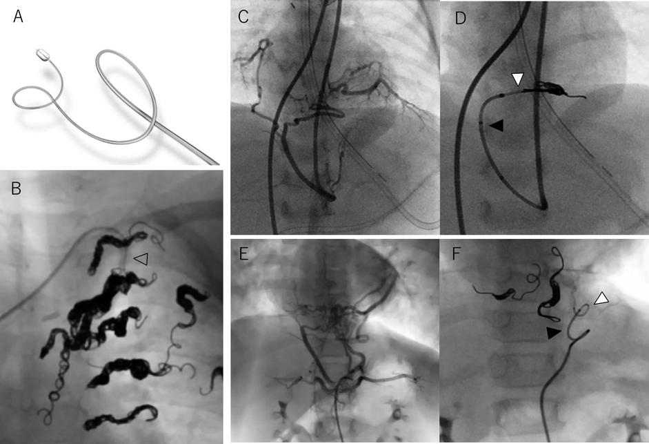 A)LOGOS™バルーン付マイクロバルーン.B)フォンタン患者の内胸動脈塞栓.親カテが挿入できなかったが近位でバルーンを拡張させ固定した状態で(矢頭)キックバックを抑えコイルを留置した.C, D)体重2.2 kgの腹腔動脈からのMAPCA. 大腿静脈から順行性にVSD経由で腹腔動脈入口部へ親カテを位置し,子カテ(矢頭黒),孫カテ(矢頭白)で血管深くまで挿入しコイル塞栓した.E, F)腹腔動脈からの著しく蛇行した側副血管をトリプルコアキシャル(矢頭黒,矢頭白)で遠位までアプローチしコイル塞栓した.
