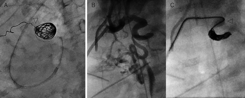 狭窄のないもしくは血流の速い血管の塞栓において,AVPをAnchoringとして使用することでコイルの脱落リスクを最小限に抑えることができる.Fig. 7Aは血流の速いBTシャントに対してAVP4をAnchoringとして留置し上流にコイルを追加して完全塞栓した.Fig. 7B, Cは血流の非常に速い右冠動脈左室瘻であったが,左室開口部にAVP4を留置し手前の瘤をコイルで充填して完全塞栓した.AVPのほかにもADOデバイスなどをAnchoringに使用することも可能である15).この方法では塞栓子デバイスをいかに病変部へデリバリーするかが最も重要であるが,ワイヤーループなどを形成することでデリバリーカテを進める方法も有用である16).AVP4は4Fr造影カテでデリバリーできる点でこの方法に使用しやすい.