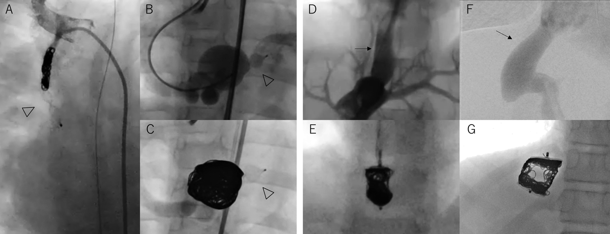 A)3.5 mmBTシャントをAVP4 5 mm(矢頭)をAnchoringとして留置し上流にコイルを追加して完全塞栓した.B, C)右冠動脈左室瘻で非常に血流が速く左室への脱落リスクがあったが,左室開口部にAVP4 8 mm(矢頭)を留置し手前の瘤をコイルで充填して完全塞栓した.D, E)径6×長さ12 mmの太く短い門脈体循環シャント血管でありAVP 12 mmを留置しコイルを充填して完全に塞栓した.F, G)最大径16 mmの太い門脈体循環シャント血管にAVP2 22 mmを留置し,ディスクの脇から挿入したマイクロカテーテルよりディスク間をコイルで充填した.
