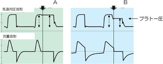auto PEEPのない症例での調節呼吸中の呼吸波形である.AとBでは,圧規定式換気のΔ吸気圧(点線両矢印)は同じである.駆動圧(実線両矢印)は,吸気終末に気道を閉塞することで得られる圧(プラトー圧と呼ぶ)とPEEPの差である. Aでは気道閉塞時(太い矢印)に流量波形を見ると,人工呼吸器からの送気がすでに終了している.そのためこの時点で気道内圧と肺胞内圧は平衡に達しており,Δ吸気圧と駆動圧は一致する.一方,Bでは気道閉塞時(太い矢印)に流量波形を見ると,人工呼吸器からの送気が残存していることがわかる.そのため肺胞内圧は気道内圧よりも低く,駆動圧(実線両矢印)はΔ吸気圧(点線両矢印)よりも小さくなる.駆動圧が死亡率に関連すると報告されており,正確に駆動圧を把握することは重要である. また,呼吸器系コンプライアンスは,患者の状態把握に重要な指標であり,以下の式で与えられるが, 呼吸器系コンプライアンス=一回換気量/駆動圧 その算出には,Δ吸気圧ではなく駆動圧を用いる必要がある.