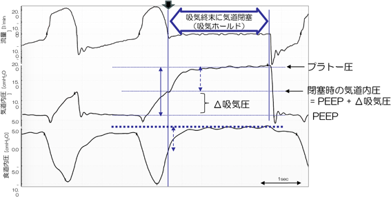 駆動圧は自発呼吸があっても,吸気終了時に気道閉塞を行うことで,測定できることが知られている.食道内圧波形を見ると,この患者が自発呼吸をしていることがわかる.吸気流量が終了した時点(流量波形の太い矢印)で気道閉塞を開始すると,その後気道内圧が上昇して一定の値に達している.気道閉塞開始時点の患者吸気陰圧(食道内圧の点線両矢印)がなくなることで,閉塞された気道内圧は閉塞した時点よりも,その分だけ上昇する(点線両矢印)ことになる.ここで得られるプラトー圧とPEEPの差(実線両矢印)が自発呼吸中の駆動圧である.こうやって測定された自発呼吸中の駆動圧も患者予後に関連することが知られている.この測定機能は,いくつかの人工呼吸器に搭載されている.
