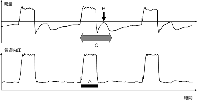 気道内圧を見ると,Aのタイミングで人工呼吸器から圧(とガス流量)が供給されていることがわかる.一方,流量波形を見ると,人工呼吸器の吸気圧がなくなるといったん呼気に転じているが,呼気の途中で,流量がゼロにいったん不自然に戻りかけているのがわかる(片矢印B).このことは,Bでは人工呼吸器の吸気圧がなくなって,胸郭の縮もうとする力で呼気流量は生じたが,患者がこの時点まで吸気努力を継続していて(C),そのために呼気流量が低下してしまったことを示唆する.本人の吸気努力時間(C)に対して,人工呼吸器の吸気送気時間(A)が短いことが原因のpremature terminationである.