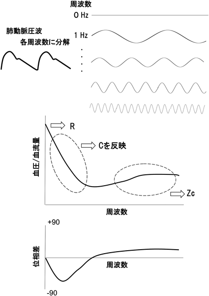 古典的Windkesselモデルは,動脈血管の進展性が第二のポンプとして作用するという概念のもとに,心臓から収縮期に供給されたエネルギーを血管壁の弾性エネルギーとして一時的に蓄え,拡張期にそれを放出することで拍動血流を緩衝させる血流成分を生み出すという循環モデルである6)(Fig. 2).本来,肺動脈圧波は無数の三角関数の合成波であると捉えることができるため,肺動脈圧波を各周波数の正余弦波に分解すると(Fourier変換),横軸にその波の周波数,縦軸にその周波数における血圧/血流量比(抵抗に相当)を取った場合に,周波数0では直線の肺動脈圧波,即ち肺動脈平均圧となり,これをQで除したものはRを表すこととなる.中間の周波数(具体的には振動角が負となる周波数)における血圧/血流量比はCを反映し,更に高い周波数における血圧/血流量比は固有インピーダンス(Zc)と呼ばれる(Fig. 3).このZcは反射波の影響を受けるため局所的血管形状の影響を受けやすくなり,このZcを加味したモデルは3因子Windkesselモデルとも呼ばれる7).