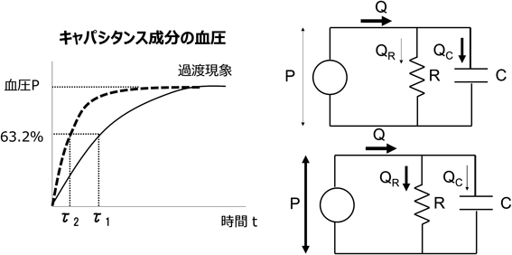 RとCは先述のように互いに独立した変数ではなく相互に影響し合う.このRC連関は反比例関係となるため,その積は一定となり,以下の関係となる. ここでτは時定数となる.これは以下のように説明される.時間tにおける肺血管キャパシタンスの成分にかかる血圧P(t)は以下のように示される(Fig. 5). つまり,t=τ=R×Cの時,キャパシタンス成分にかかる血圧が全体の1−e−1=63.2%となることを表すのでτが時定数とされる.肺高血圧のない健常者でのτ平均値は0.35secとされる18).例えば肺高血圧を合併した心室中隔欠損症患者の肺動脈圧波を観察すると,同じ肺動脈収縮期圧あってもその脈圧が大きい場合と小さい場合が観察され,結果として肺動脈平均圧が異なることがある.脈圧の大きいほど肺動脈圧が収縮期圧の63.2%に低下するまでに時間がかかることになるため,τが大きいことを反映する.このτは肺血管のキャパシタンス成分が飽和される過渡現象までの時間の目安となる19–21).したがって左右短絡があり肺血流が増加した場合,τが小さいとより早期にキャパシタンス成分は過渡現象に至り,血流はより抵抗成分へ流れていくこととなり(QR増加からQR×R=Pの増加を招き),結果として循環全体の駆動圧増加を生じる(Fig. 5).