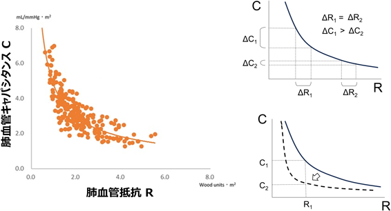 実際に心臓カテーテル検査によって求めたRとCをプロットするとFig. 6のように反比例関係となる9, 22).このRC連関双曲線の形状を決定する因子であるτがキャパシタンス成分の過渡現象までの時間を反映し,肺血管床の特性を反映すると言える.従来,τは個体間で不変と考えられていたが,実際は年齢,心拍数や左房圧などによって変化することが知られており,加齢,心拍数増加,左房圧上昇によりτはやや低下する4, 21, 23–25).また双曲線の性質上,R値が高い場合はτが変化してもC値はほとんど変化しないものの,R値が正常に近い場合はτの変化によりC値が鋭敏に変化するため,実臨床においてはC値の変化に注視することがより鋭敏に肺血管の特性を観察できると考えられる22).しかしながら同一個体内ではτはほぼ一定のため,治療介入を加えた場合,RとCの値はこの曲線上を動くことになると考えられている26).