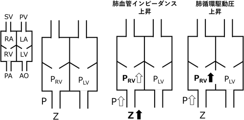 実際の臨床では,理学所見より呼吸状態の観察やII音肺動脈成分の亢進の程度と分裂幅を覚知し,心尖部や胸骨左縁下部での拡張期ランブルの存在を注意深く聴取することが最も重要であることは言うまでもないが,様々な画像および機能診断を併用することで病態への理解を更に深めてゆく必要がある.そもそも肺高血圧は肺循環駆動圧(P)上昇と肺循環インピーダンス(Z)上昇の二つの機序によって生じ(Fig. 7),それには以下の病態が交絡している.