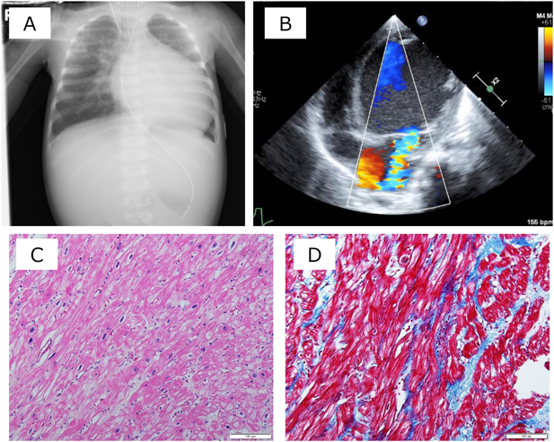 (A) Chest X-ray image shows cardiomegaly and pulmonary congestion. (B) Echocardiography shows left ventricular dilatation and moderate mitral valve regurgitation. Cardiac biopsy shows mild disarray and vacuolization around the nuclei of cardiomyocytes by Hematoxylin–Eosin staining (C) and mild interstitial fibrosis by Masson-trichrome stain (D). Scale bar: 100 µm.