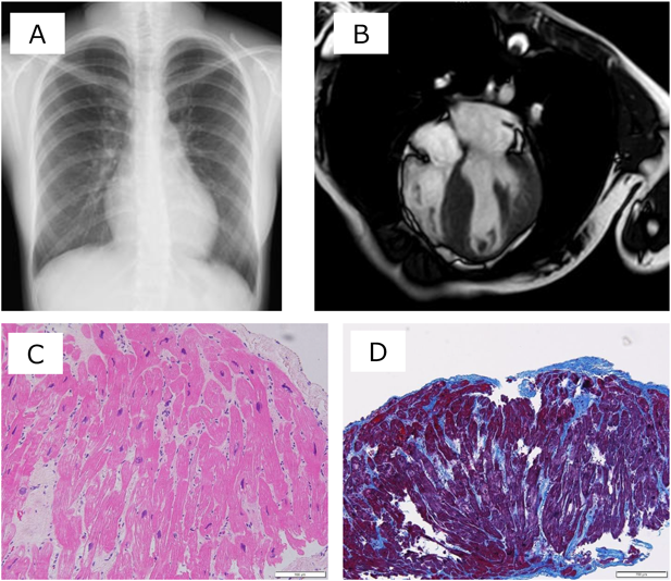 (A) Chest X-ray image shows no cardiomegaly nor pulmonary congestion. (B) Cardiac magnetic resonance image shows hypertrophy of left ventricular wall. Cardiac biopsy shows cellular hypertrophy of cardiomyocytes by Hematoxylin–Eosin staining (C) and mild interstitial fibrosis by Masson-trichrome stain (D). Scale bar: 100 µm.