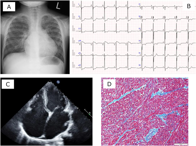 (A) Chest X-ray image shows dilatation of atria and severe pulmonary congestion. (B) Electrocardiogram indicates left atrial dilatation and ST-T changes in II, III, aVF, V2-6. (C) Echocardiography shows severe left and right atrial dilatation with preserved ventricular contraction. (D) Cardiac biopsy shows disarray of cardiomyocytes and mild interstitial fibrosis by Masson-trichrome stain. Scale bar: 100 µm.