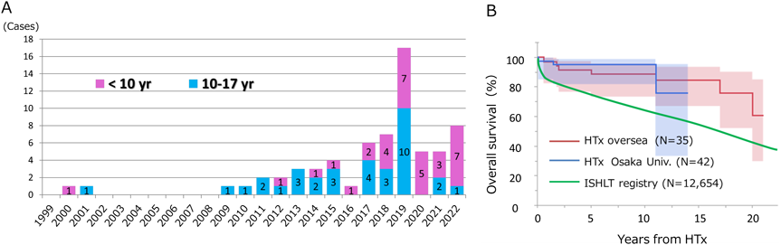 (A) The number of cases for pediatric heart transplantation in Japan. (B) The Kaplan–Meier curve for overall survival after heart transplantation (HTx) in the patients who are managed in Osaka University, and received HTx in oversea (red line) and in Osaka University (blue line). The shadows delineate the 95% confidence intervals.