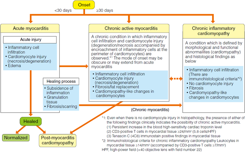 心筋炎の概念図をFig. 1に示す.発症様式や時間経過により,急性心筋炎,慢性活動性心筋炎,慢性心筋炎,慢性炎症性心筋症,心筋炎後心筋症に分類された.急性心筋炎と慢性活動性心筋炎はいわば現在進行形の心筋炎で,炎症細胞浸潤と心筋細胞傷害をともに有する活動性心筋炎である.慢性心筋炎および慢性炎症性心筋症はその時点において炎症細胞浸潤を認めるものの心筋細胞傷害を伴わない.心筋炎後心筋症は,心筋炎は治癒しているが線維化や瘢痕とともに機能障害が残存するものである.従来のガイドラインで「慢性心筋炎」として扱われた疾患概念は「慢性活動性心筋炎」として再定義されている.