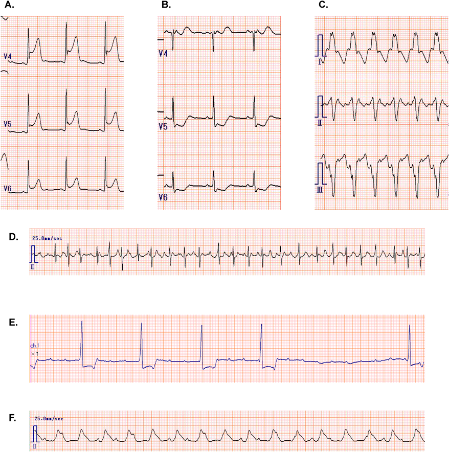 A) ST elevation. B) ST depression. C) Ventricular tachycardia. D) Multifocal atrial tachycardia. E) Advanced atrioventricular block. F) Complete atrioventricular block with wide QRS.