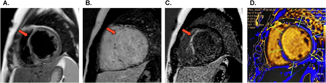 A) T2-weighted black blood imaging. Arrow indicates regional high T2 signal intensity. B) Early gadolinium enhancement imaging. Arrow indicates positive finding of the enhancement. C) Late gadolinium enhancement imaging. Arrow indicates positive finding of the enhancement. D) T1 mapping showed prolonged native T1 values (mean 1251 ms; reference value 1050+/−50 ms) and extracellular volume fraction increased to 46.6%.