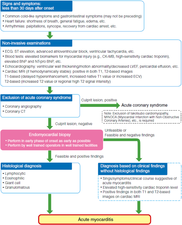 症状・徴候から心筋炎が疑われ,発症から30日未満の経過で,非侵襲的検査(心電図,血液検査,心エコー図,心臓MRI)で心筋炎を支持する所見を認める場合,虚血性心疾患を除外し,心内膜心筋生検で心筋炎の病理像(炎症細胞浸潤,心筋細胞傷害)が認められれば急性心筋炎と確定診断する.心筋生検施行不可能あるいは採取した標本に心筋炎の病理像がない(サンプリングエラー)場合でも,急性心筋炎を示唆する症状・徴候・臨床経過があり,高感度心筋トロポニン値の上昇,心臓MRIで急性心筋炎画像診断基準(Lake Louise Criteria, T1基準かつT2基準)を満たせば,急性心筋炎と確定診断する.